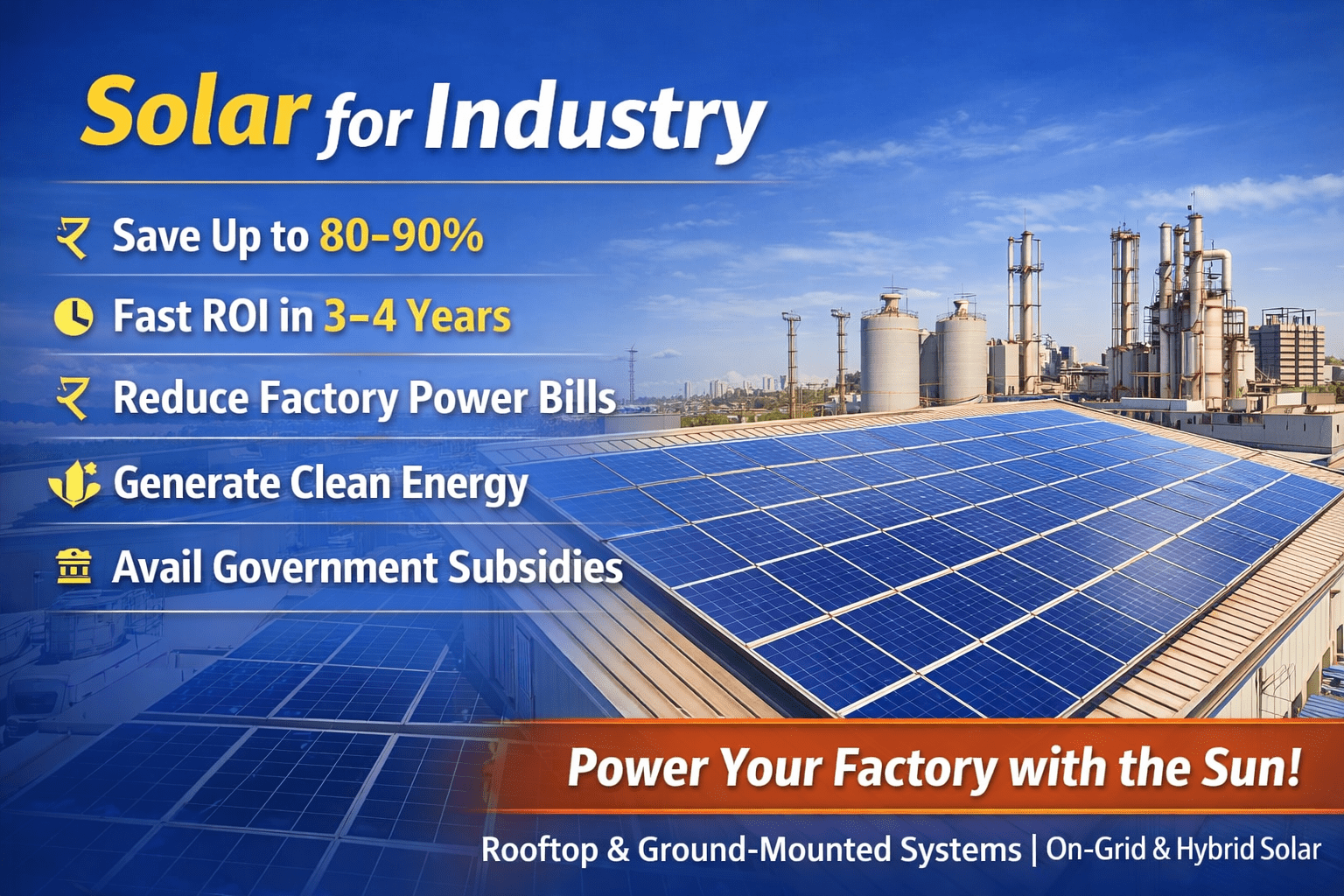 Factories consume a huge amount of electricity for machinery, production lines, and operations. Installing a rooftop solar system for factory helps reduce electricity bills and ensures long-term savings.