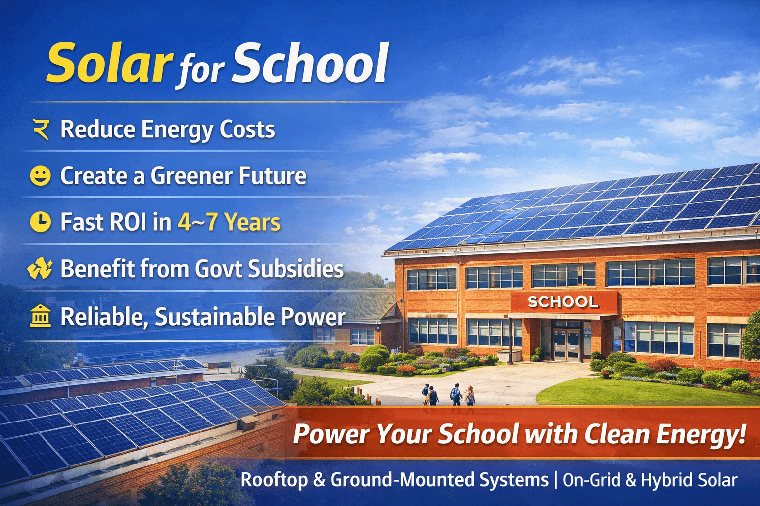 Switch to clean and cost-effective energy with solar power solutions for schools. Installing a rooftop solar system helps schools reduce electricity bills, promote sustainability, and create a better learning environment.