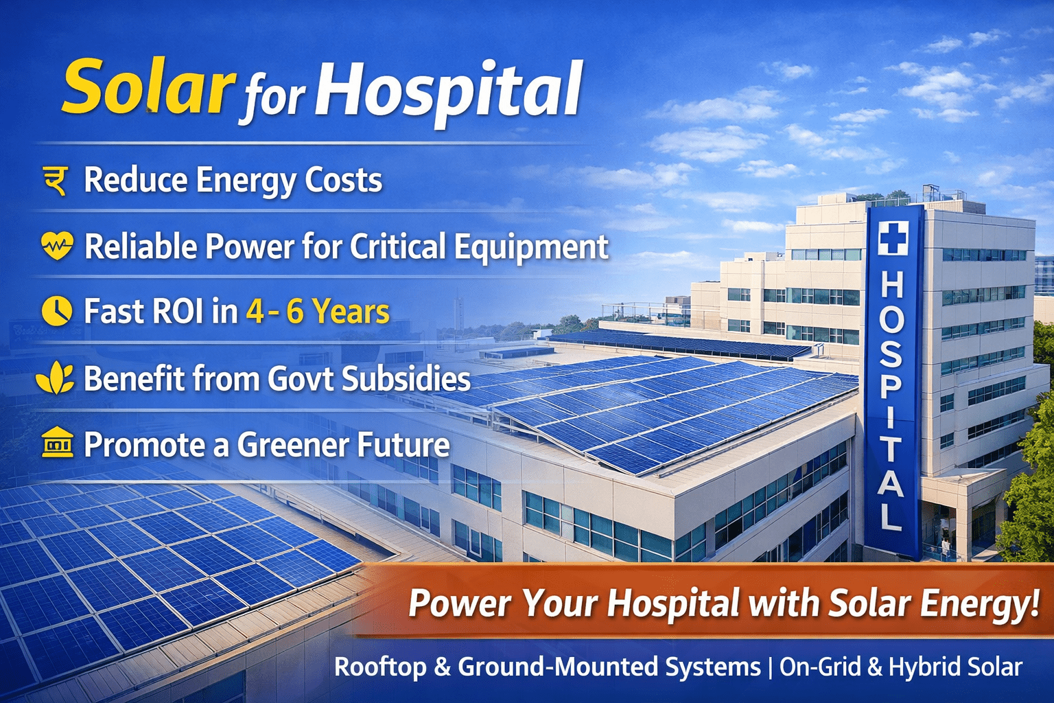 Hospitals require 24/7 uninterrupted power supply for critical operations. Installing a rooftop solar system ensures reliable, clean, and cost-saving energy for hospitals.